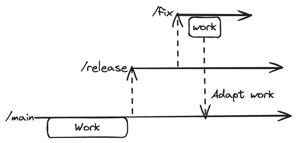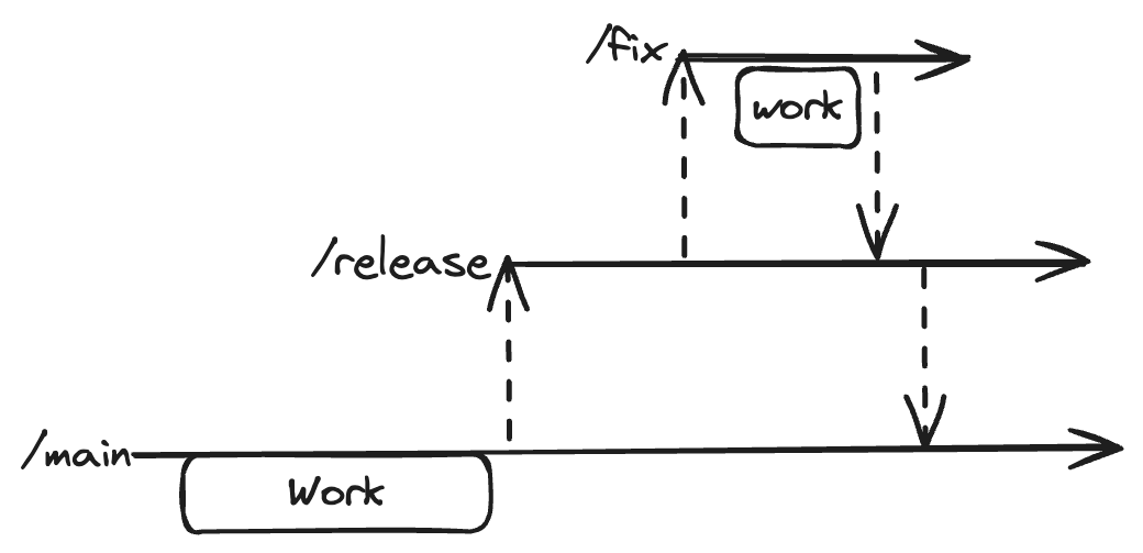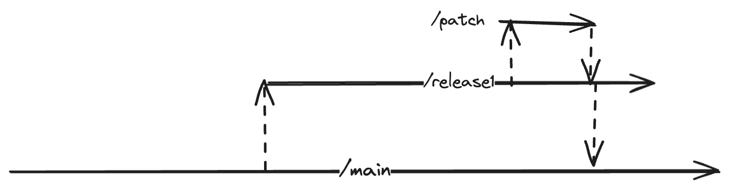 When deploying code to any environment, branch (or tag) to create a Release Line. This branch identifies the released version. You can add changes to the branch should you need to deploy a fix before the next regular release cycle. Limit the number of active release lines to 1. Patch releases should be rare.