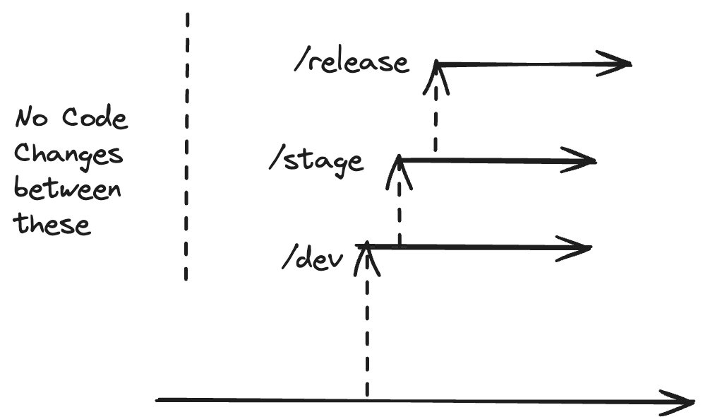 If you use pre-release environments, each environment branch is a release line. If you have more than one (dev, stage, prod) ideally each should start from the same point on the Main Line. If you are using a time-boxed development cycle, aim to deploy to the production environment one or more times per cycle to avoid pre-release stages from diverging from each other.