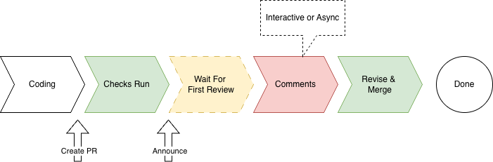 The format of the feedback matters as well. Pull Requests are often asynchronous: you share a review, someone comments, you respond, and so on. While asynchronous feedback has a place when teams are distributed or if the feedback is straightforward, it also has costs, especially when the feedback cycle is slow to get started. A conversation via Pull Request comments can lead to delays between each comment/reply cycle, stretching out the review process unreasonably.